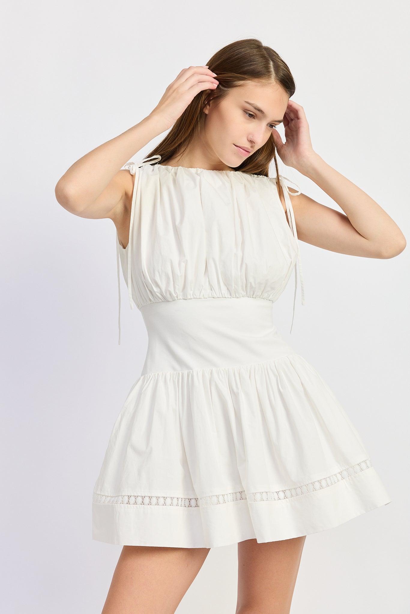 Tie Shoulder Bubble Bust Knit Waist Mixed Media Mini Dress
