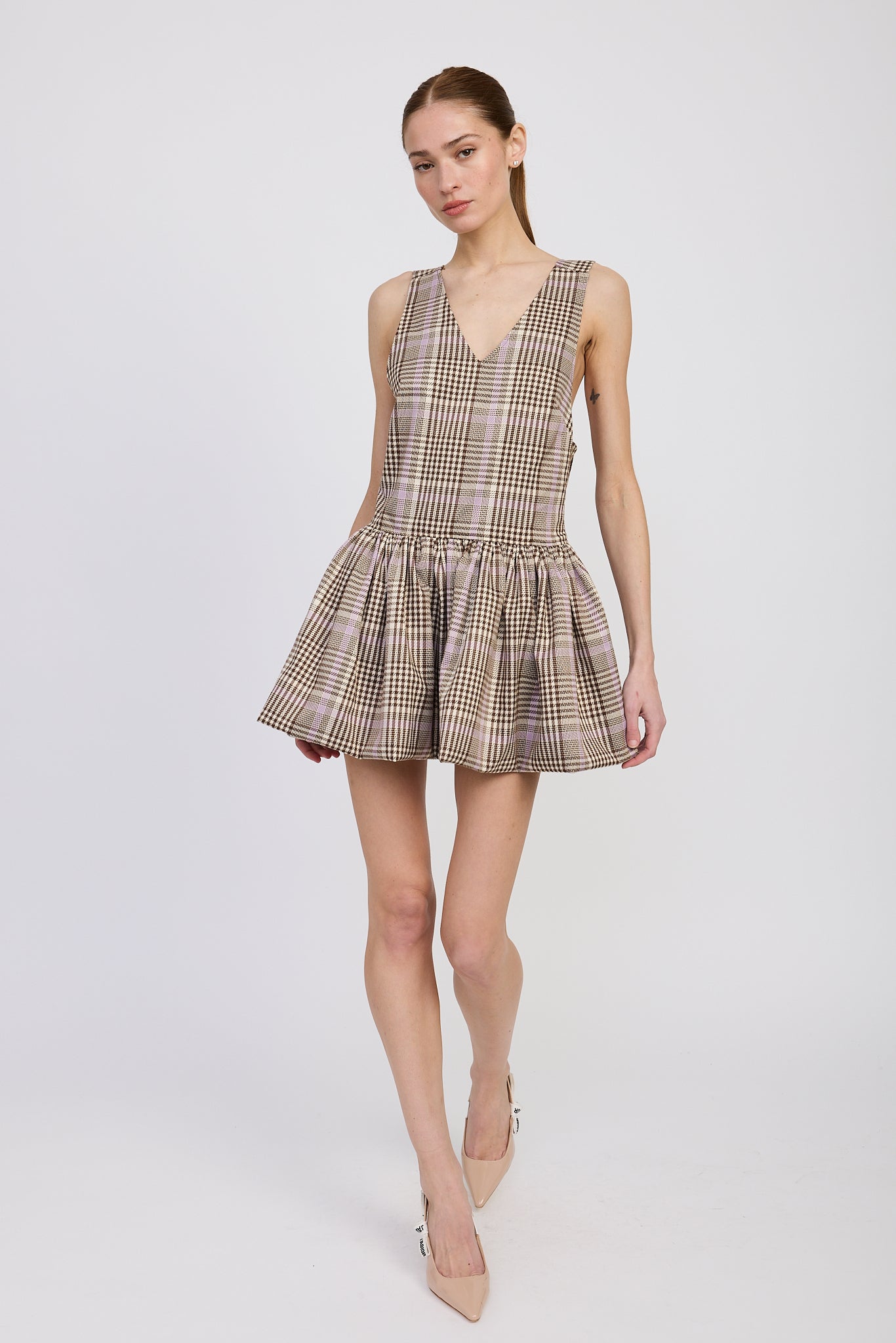 - Sleeveless Structured Bubble Hem Statement Bow Back Mini Dress
