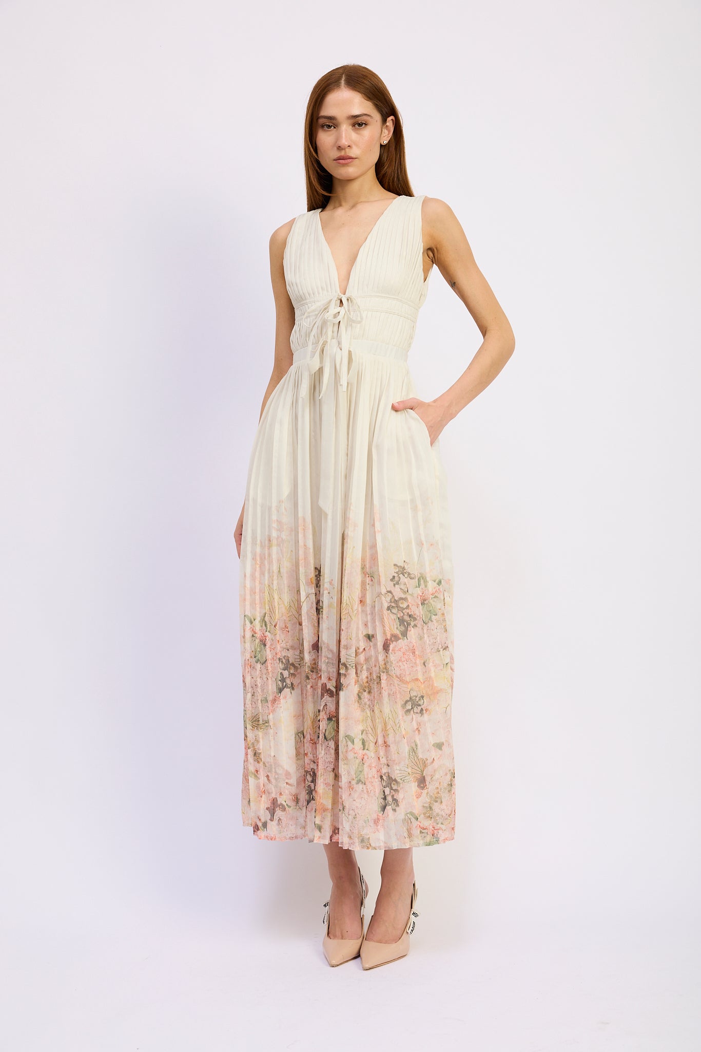 Tie Front Sleeveless Pleated Border Print Maxi Dress