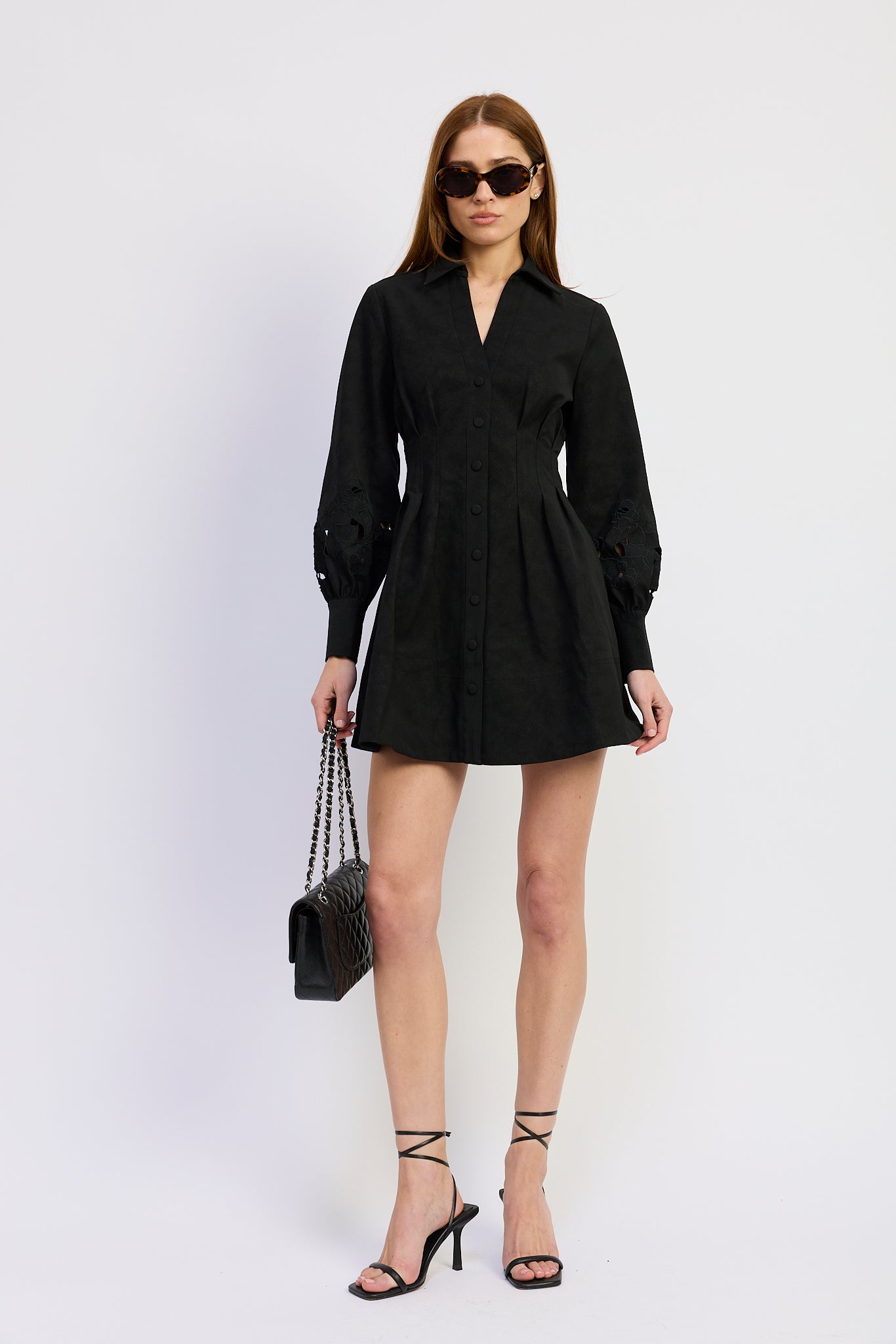 Button Front Collared Mini Shirt With Laser cut Floral Long Sleeves