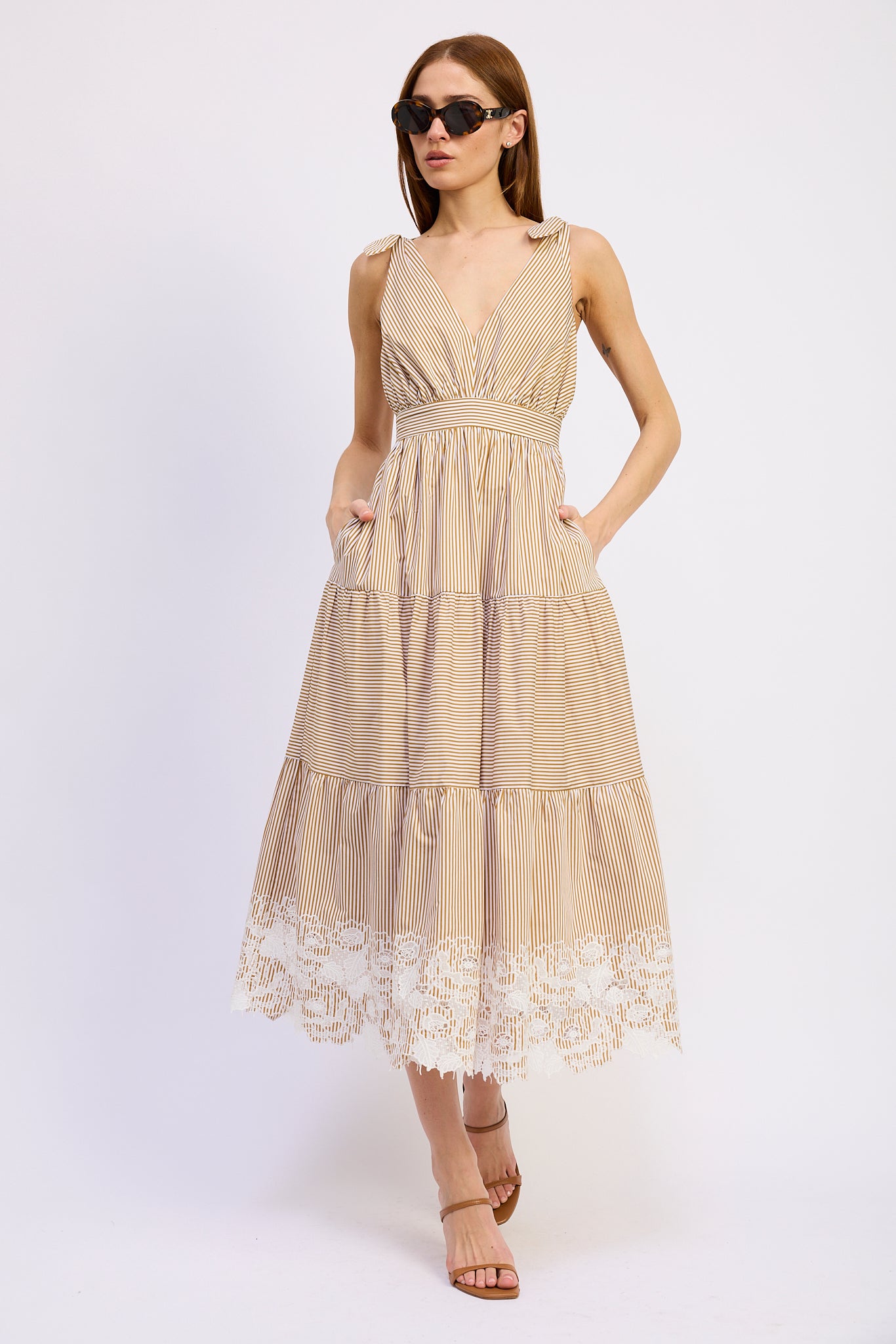 Stripe Placement Tie Shoulder Maxi Dress With Floral Embroidered Peplum Hem
