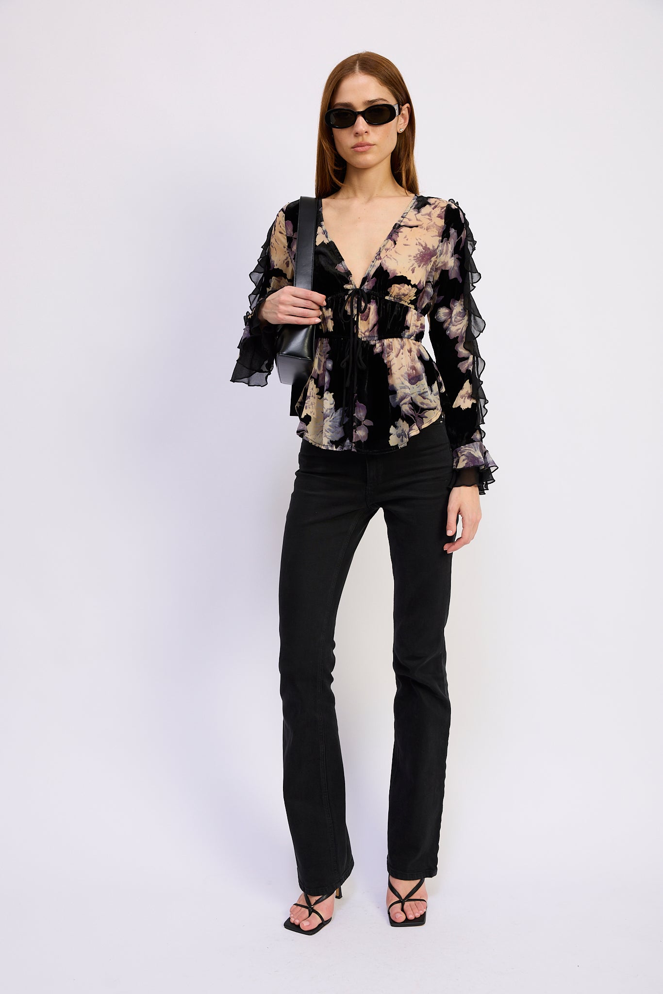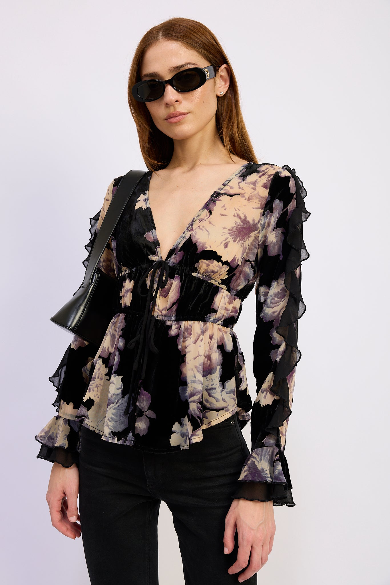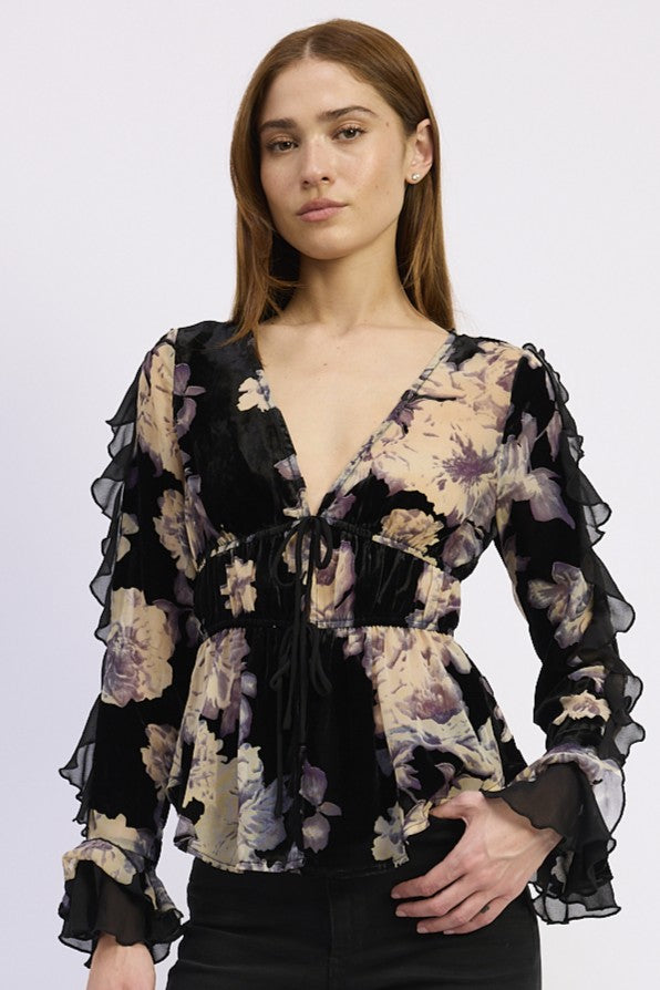 Burnout Collared Tie Front Flyaway Ruffle Blouse