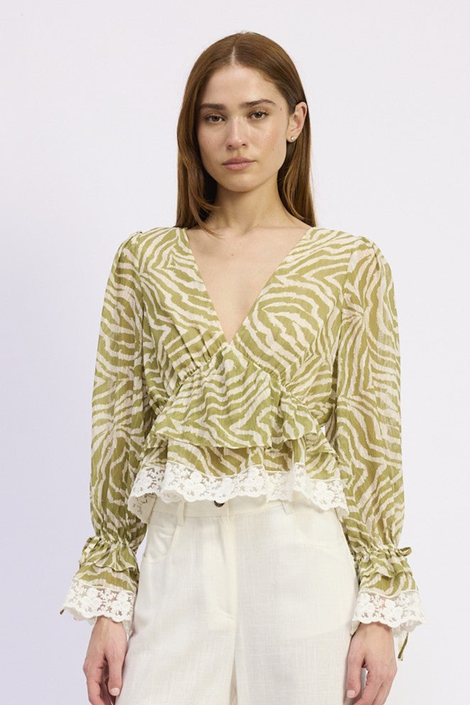 Double V Lace Trim Ruffle Long Sleeve Blouse