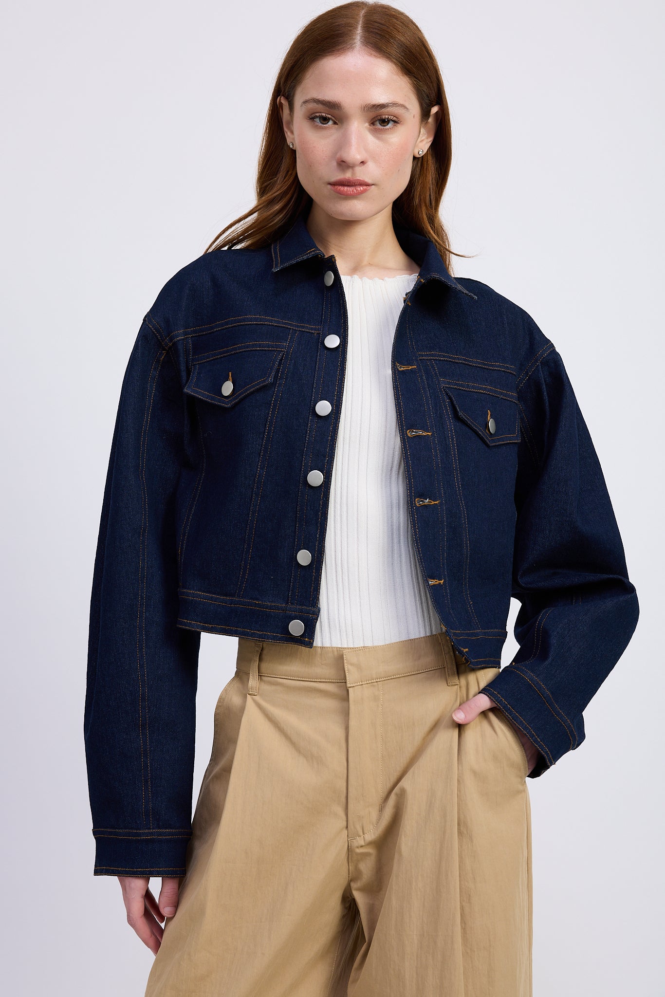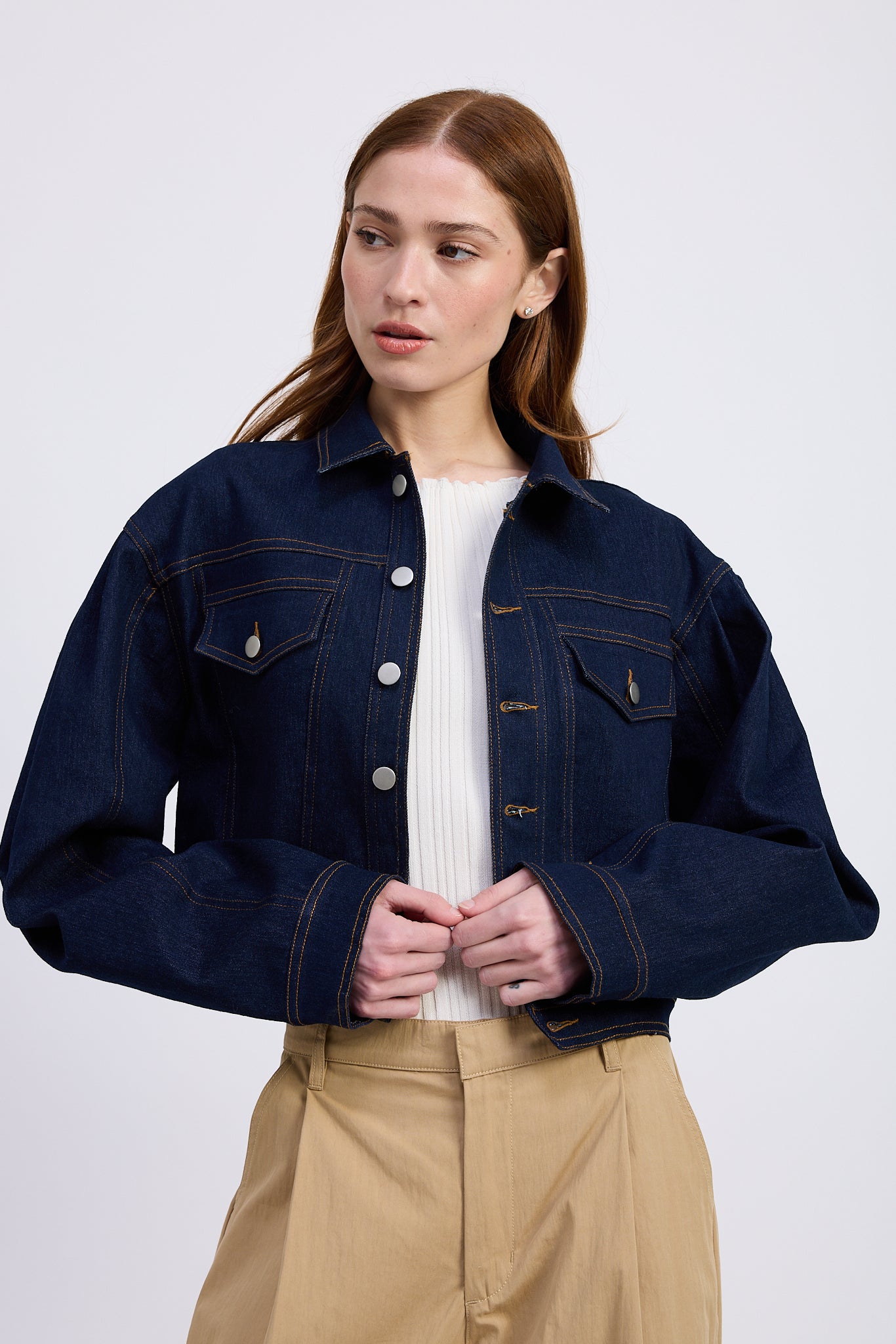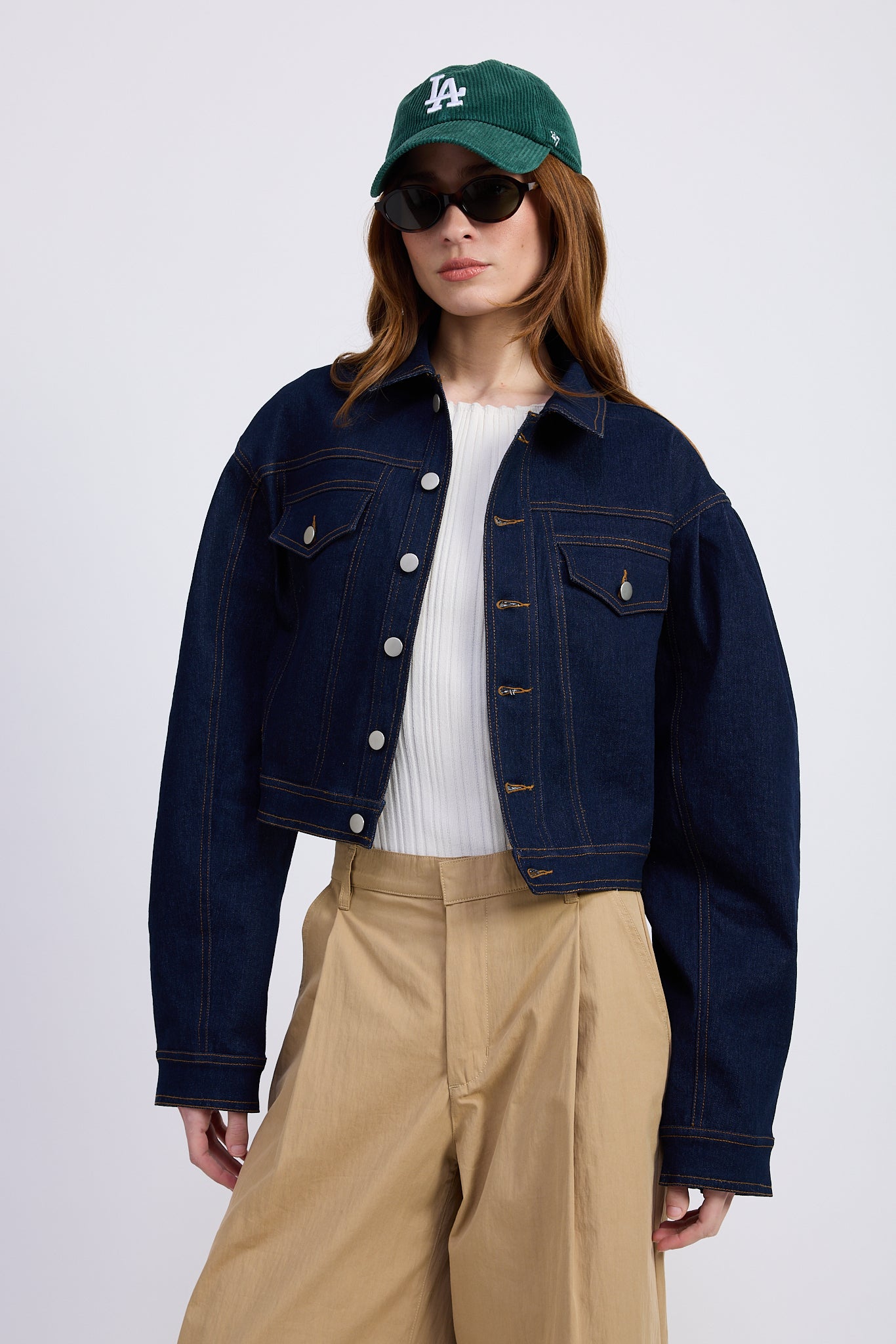- Pleat Balloon Sleeve Denim Crop Jacket