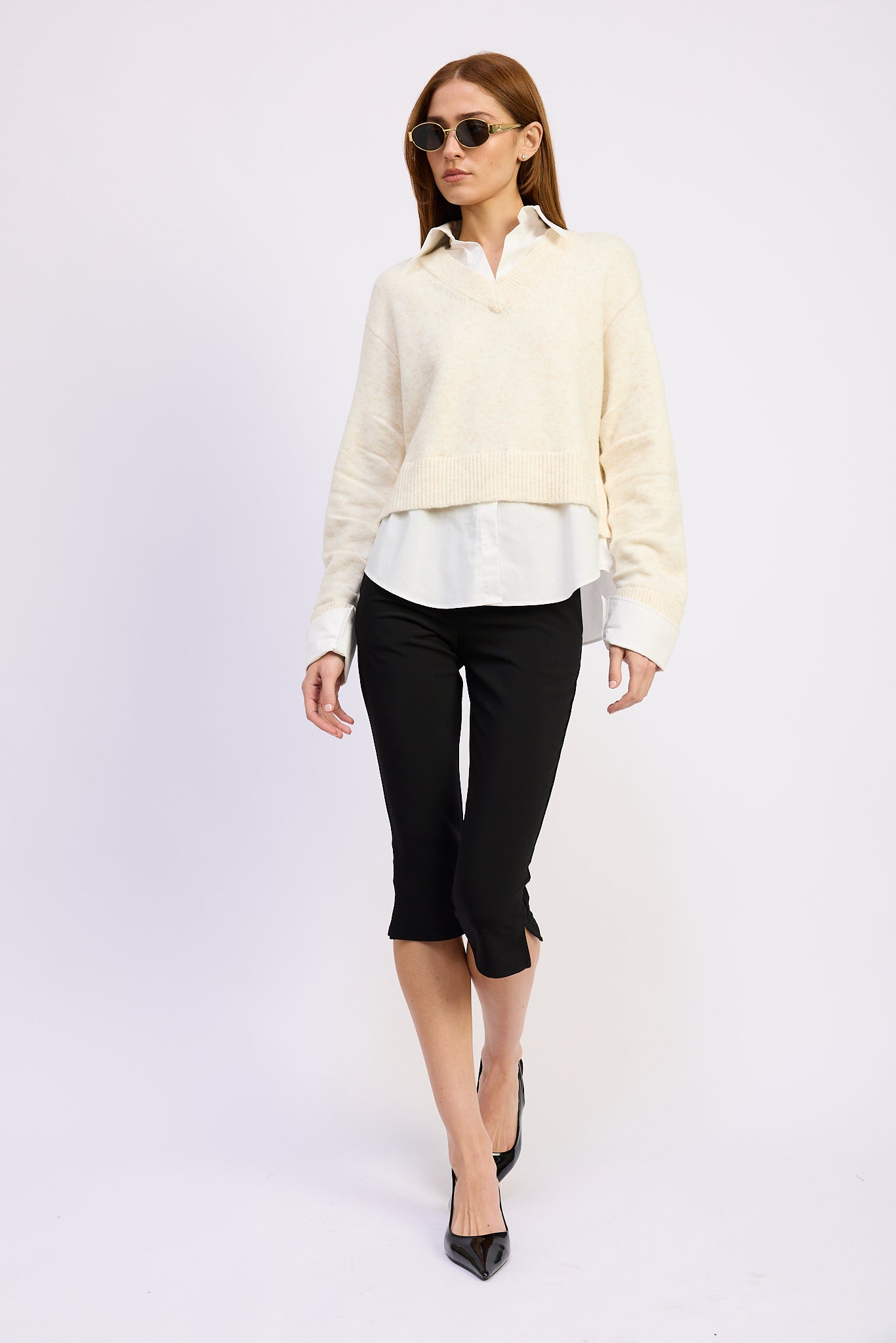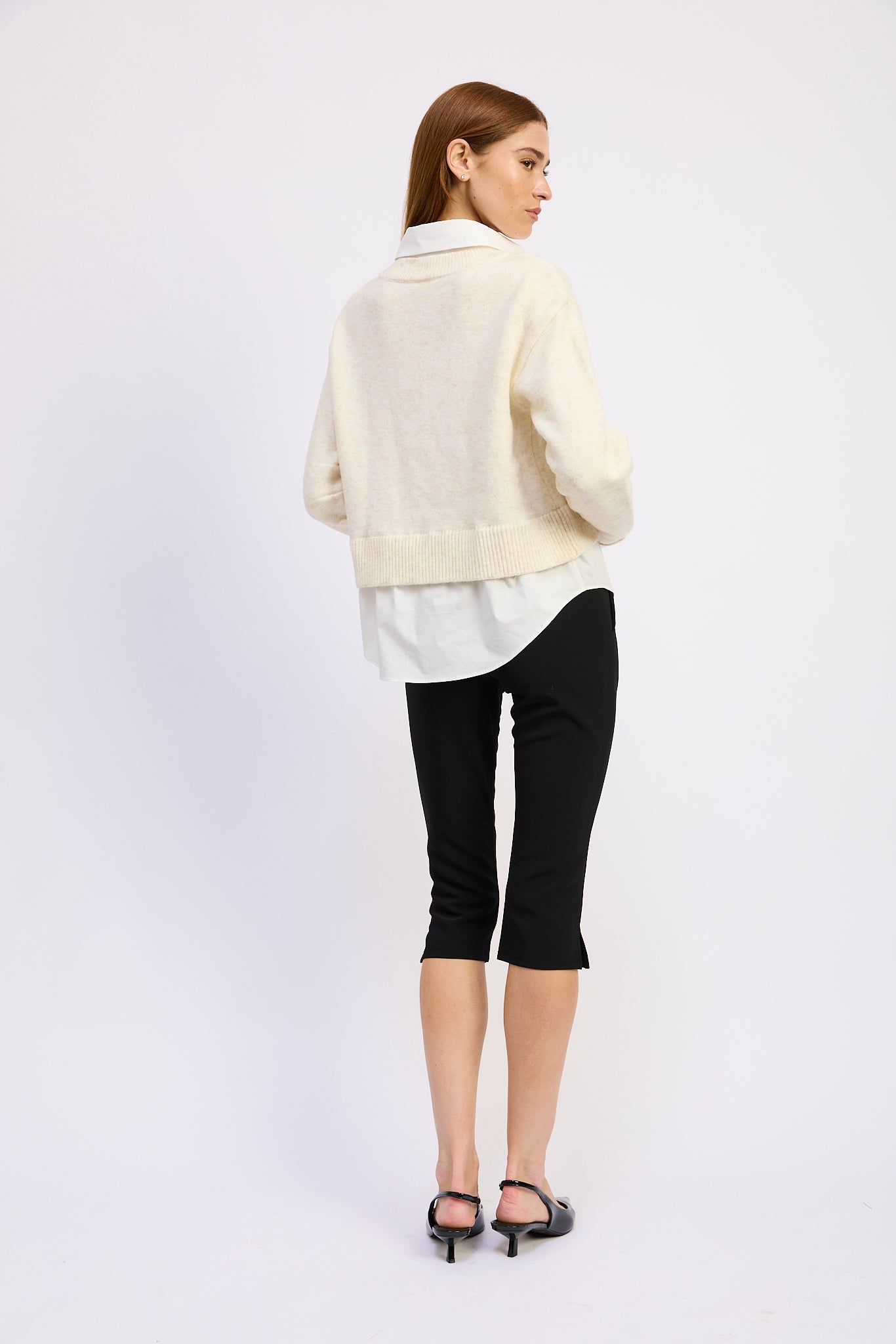 Mixed Media Drop Shoulder V-Neck Knit Sweater Pullover With attached Poplin Faux Shirting